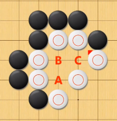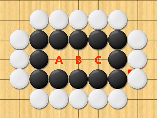 A、B、C三个点如果黑棋下在B处则可以做成2个眼,盘活自己,而作为白棋就要提前下在B点,防止黑棋做活自己。