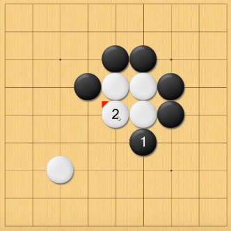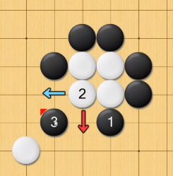 当发现白棋只有两口气的时候(第2步),黑棋就可以开始征吃了,具体措施为白棋往哪里跑,黑棋就往哪里追。最后一定可以将白棋通杀。但是必须要注意的是,不能无脑征吃,一定要看在白棋逃跑的方向上是否还有其他白棋作为接应,否则很容易被反杀。如下图,就不能征吃白棋。