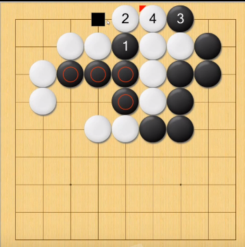 可以看到经过4步棋,白棋即使连接了起来,黑棋下在黑点的地方,白棋依然死棋,故称为接不归。再看下面的例子: