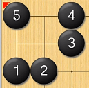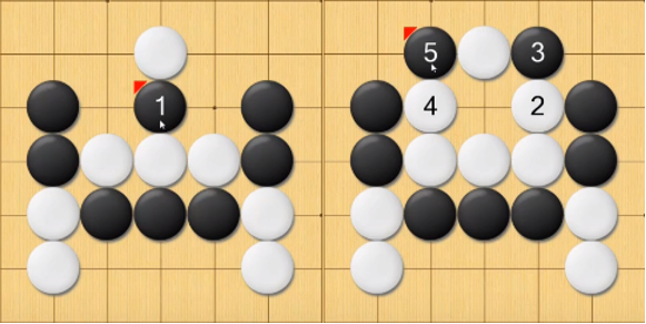 从左图到右图,黑棋使白棋成了一个接不归,这使无论白棋下在24中间,还是上方,内部的白棋都已成为死棋。其中左图中1这一着就叫做扑。